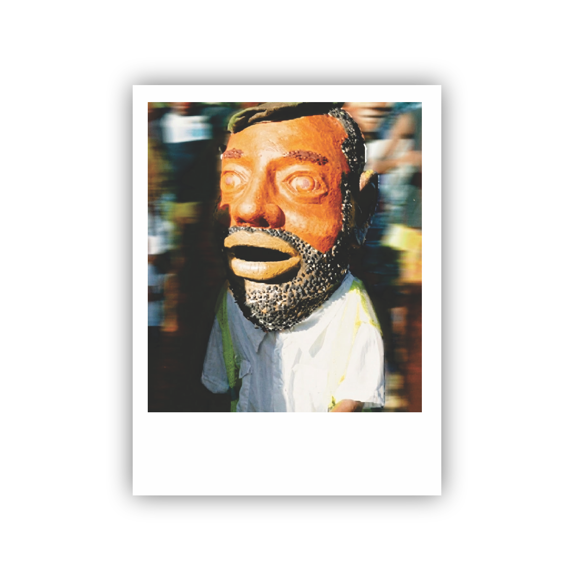 En los desfiles urbanos de Mozambique, las marionetas gigantes de papel maché permiten crear figuras alegóricas de escala monumental y baja densidad. La técnica de modelado genera rostros de rasgos fijos que resultan en una mirada estática y artificial, proyectada sobre la multitud desde una altura que carece de vida biológica.